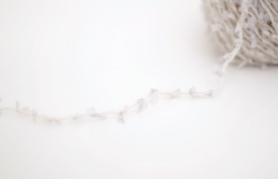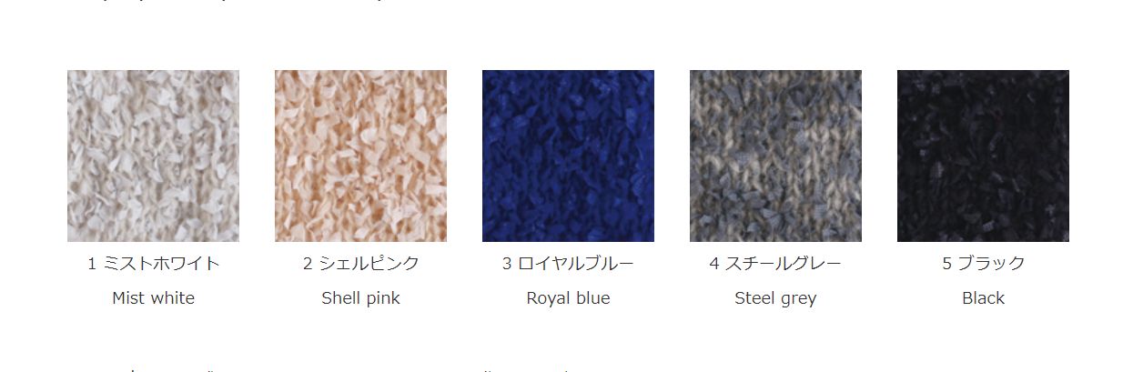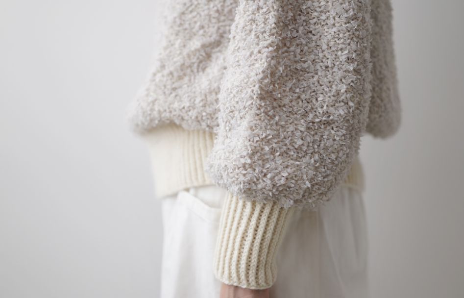 The yarn looks like tiny petals fluttering down on misty mohair. The soft, light, and sweet atmosphere of the knitted fabric reveals its individuality even when knitted in a simple way.