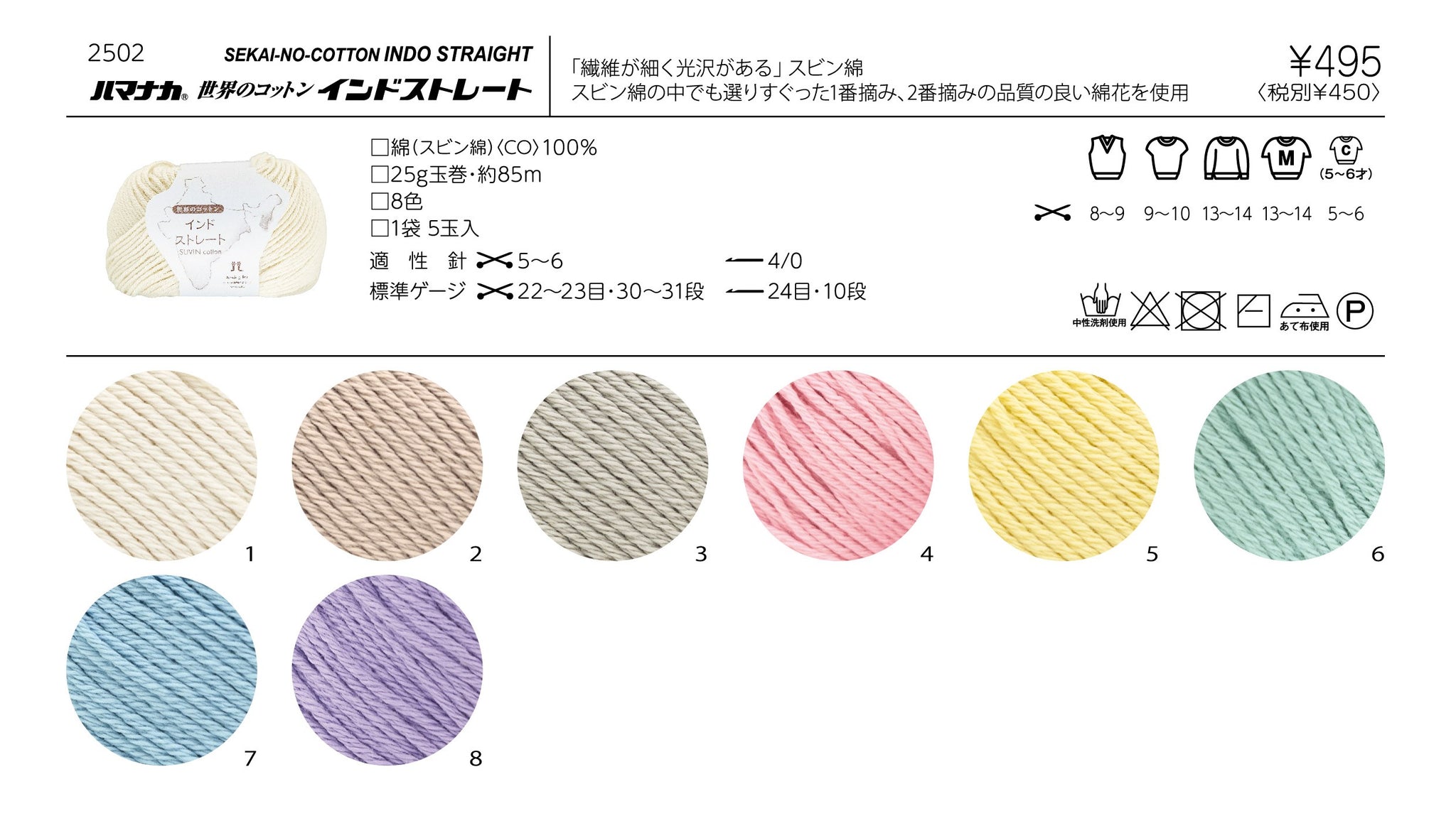 *We do not keep this product in our stock. Please allow an addition 5-7 days for delivery.* Fibers Cotton 100% (Suvin cotton) Weight 25g Length 85m Straight-pointed needle Japan size 5-6 Crochet hook Japan size 4/0 Guage ST 22-23stitches and 30-31rows