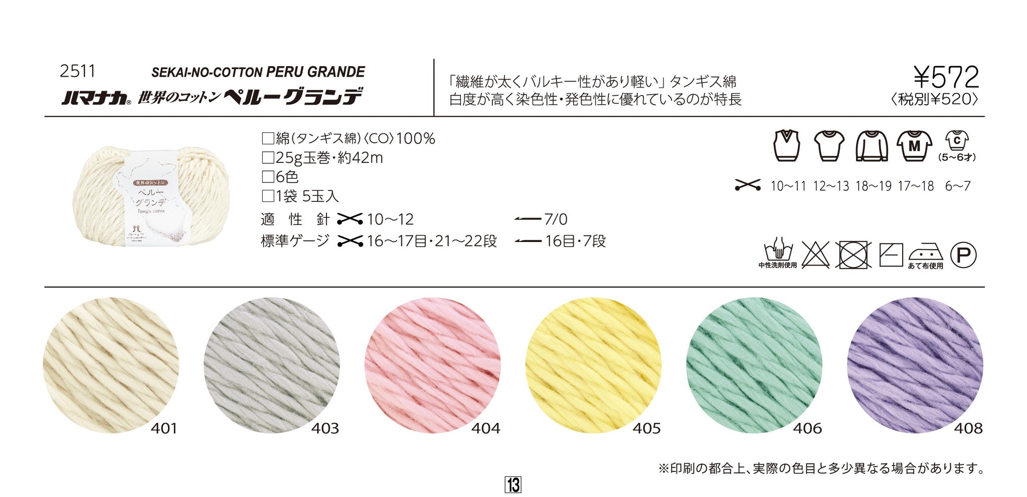 *We do not keep this product in our stock. Please allow an addition 5-7 days for delivery.* Fibers Cotton 100% (Tangis cotton) Weight 25g Length 42m Straight-pointed needle Japan size 10-12 Crochet hook Japan size 7/0 Guage ST 16-17stitches and 21-22rows