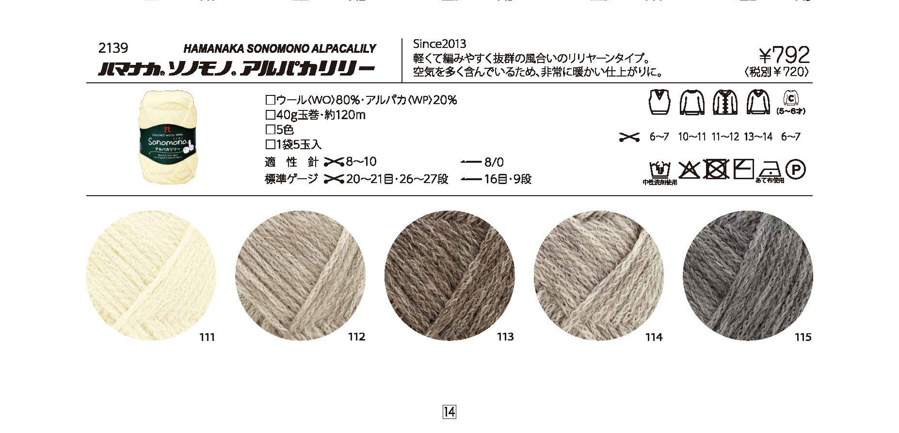 *We do not keep this product in our stock. Please allow an addition 5-7 days for delivery.*FibersWool 80%Alpaca 20%Weight 40gLength 120mStraight-pointed needle Japan size 8-10Crochet hook Japan size 8/0