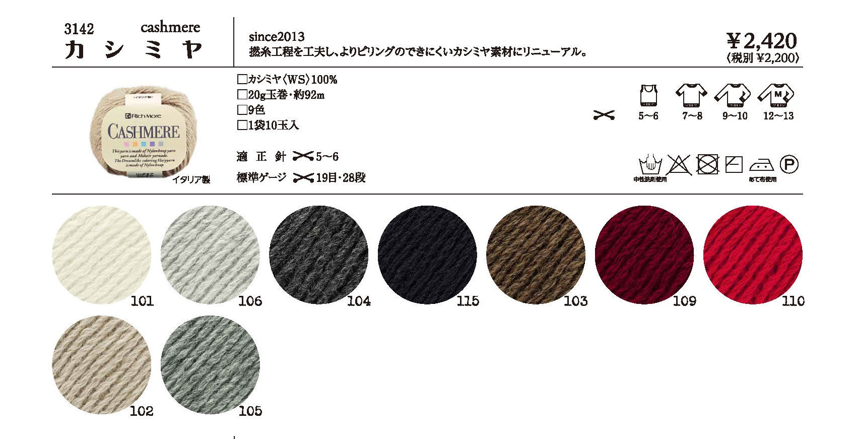 *We do not keep this product in our stock. Please allow an addition 5-7 days for delivery.*FibersCashmere 100%Weight 20gLength 92mStraight-pointed needle Japan size 5-6