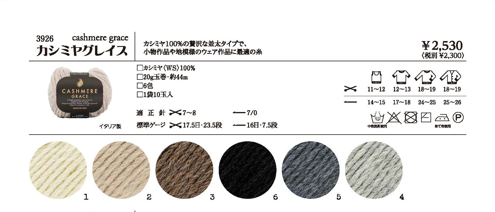 *We do not keep this product in our stock. Please allow an addition 5-7 days for delivery.* Fibers Cashmere 100% Weight 20g Length 44m Straight-pointed needle Japan size 7-8 Crochet hook Japan size 7/0